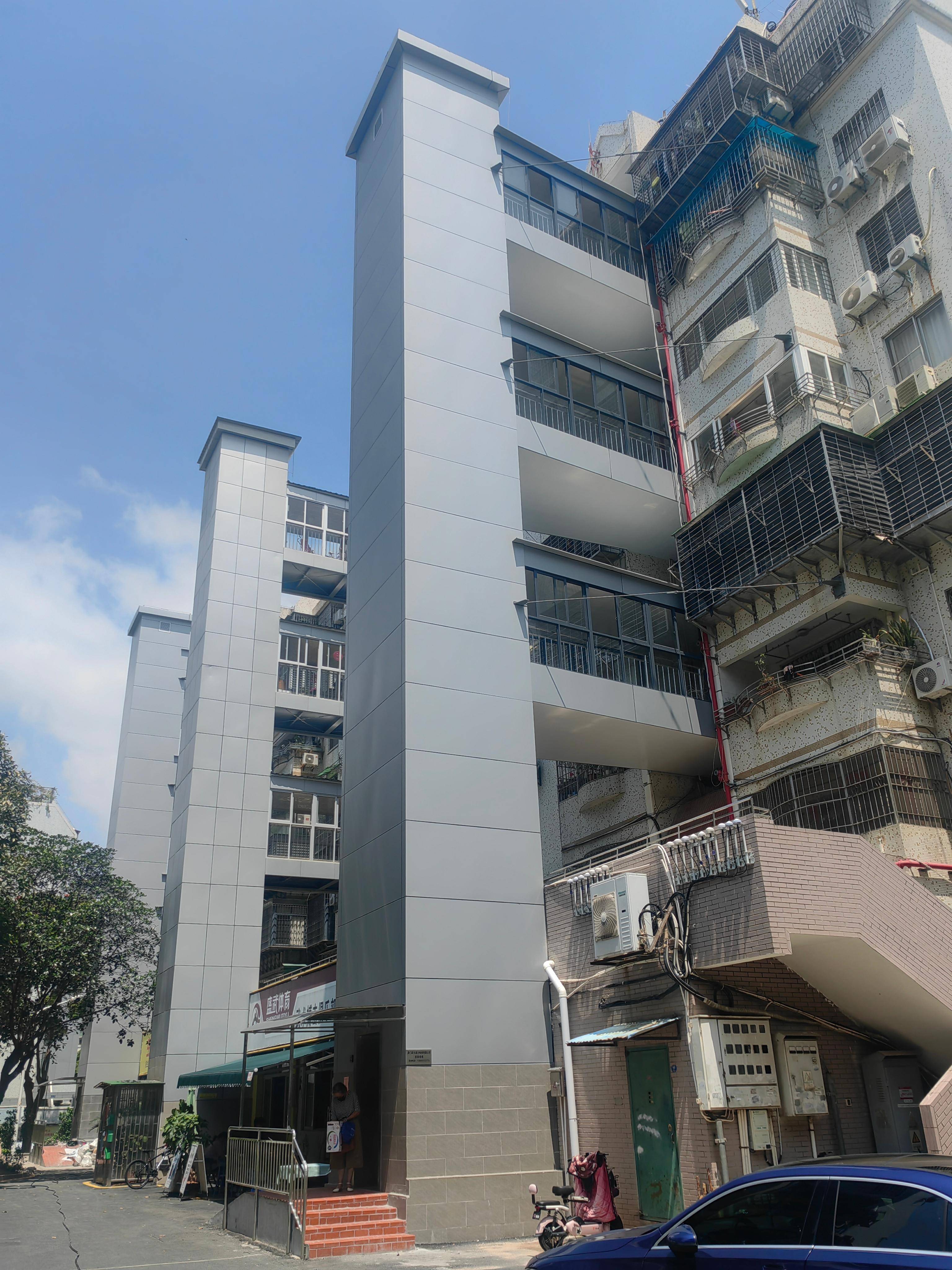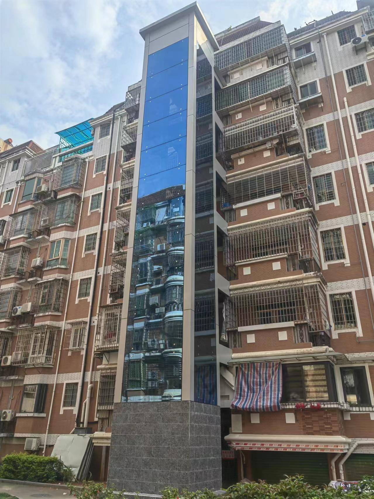 在福州某建于1998年的6层住宅小区中,原有楼体未预留电梯井道,且住户以老年人为主,加装需求迫切。厦门亚太通力电梯有限公司通过现场勘测,定制了“钢结构井道+观光电梯”方案: